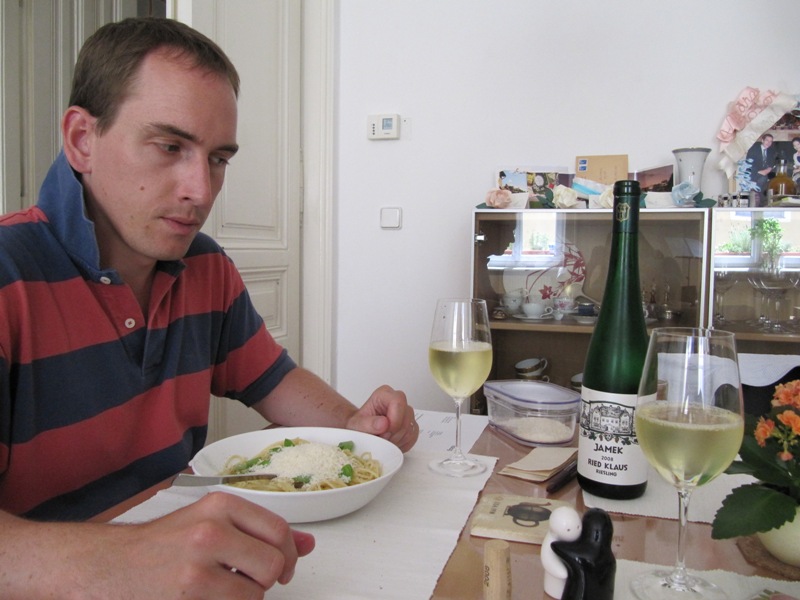 写真は7月11日、猛暑まっさなかのお昼ご飯、スパゲッティバジリコ(バジリコは日の当たらないところに入れていたので生き残りました)。暑いときはきりりと冷えたWachau渓谷の白ワイン♪